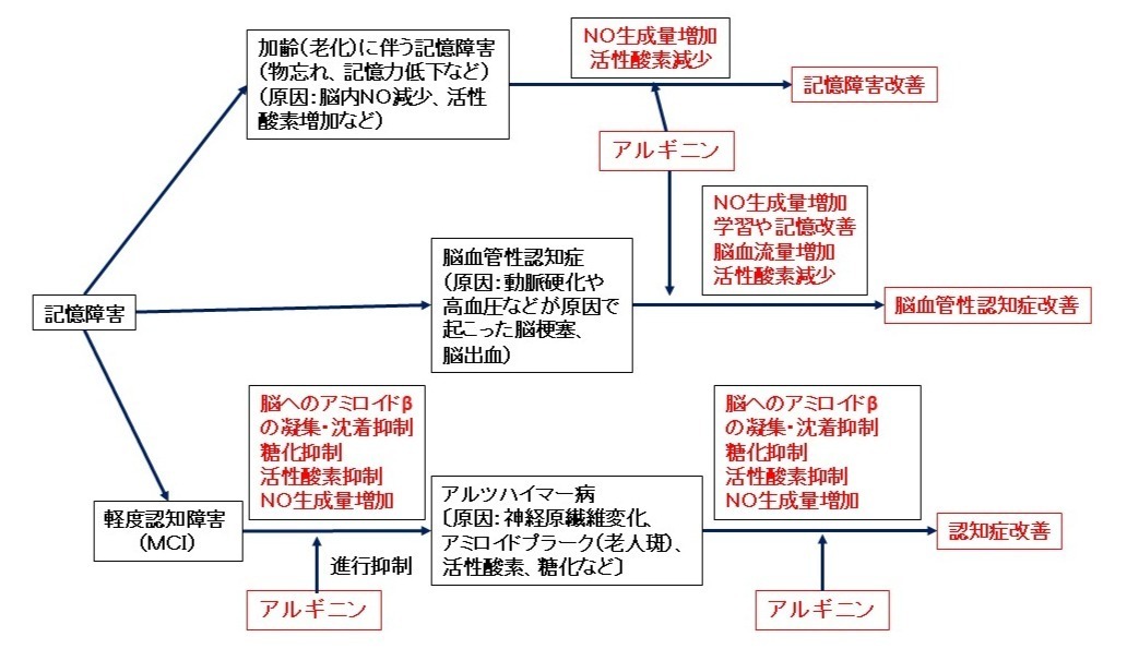 アルギニンは、アミロイドβの脳内への凝集・沈着の抑制、糖化抑制、抗酸化、NO生成促進作用などを有しますので、軽度認知障害(MCI)を予防・改善することが期待できます。